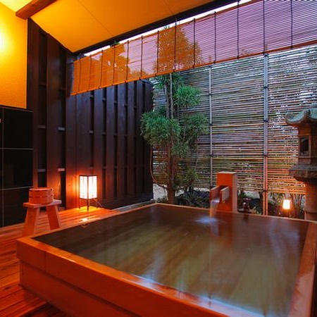 貸切露天風呂「初川の湯」は初川のせせらぎと竹林を眺める風情ある造りで、pH7.9の弱アルカリ性美肌の湯が源泉かけ流しで楽しめます。