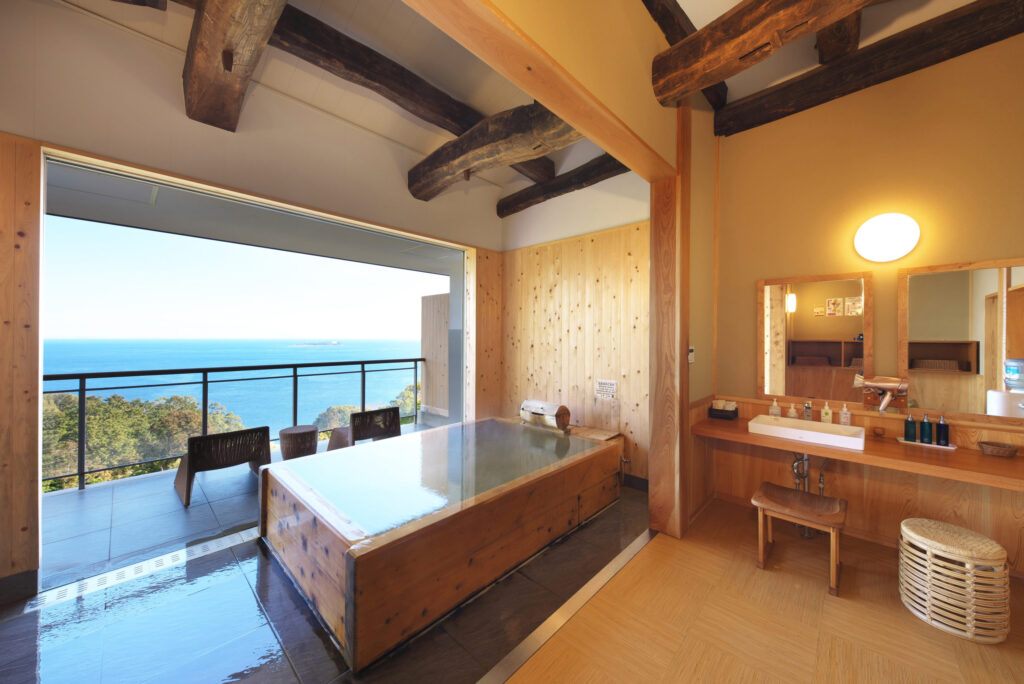 全室和室のオーシャンビューと、伊勢海老・タラバガニ・鮑など豪華な食材を使ったランチプランが魅力の温泉宿です。