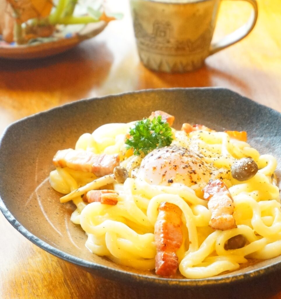 中でも看板メニューの「カルボナーラうどん」は、濃厚なカルボナーラソースと絹腰うどんの相性が抜群です。
