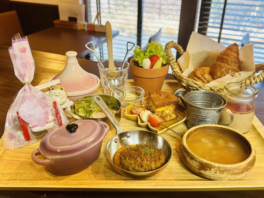 まるでままごとのような可愛らしさながら、こだわり3種の焼きたてパン、手ごねミニハンバーグ、ミニグラタンなど本格的な味わい。