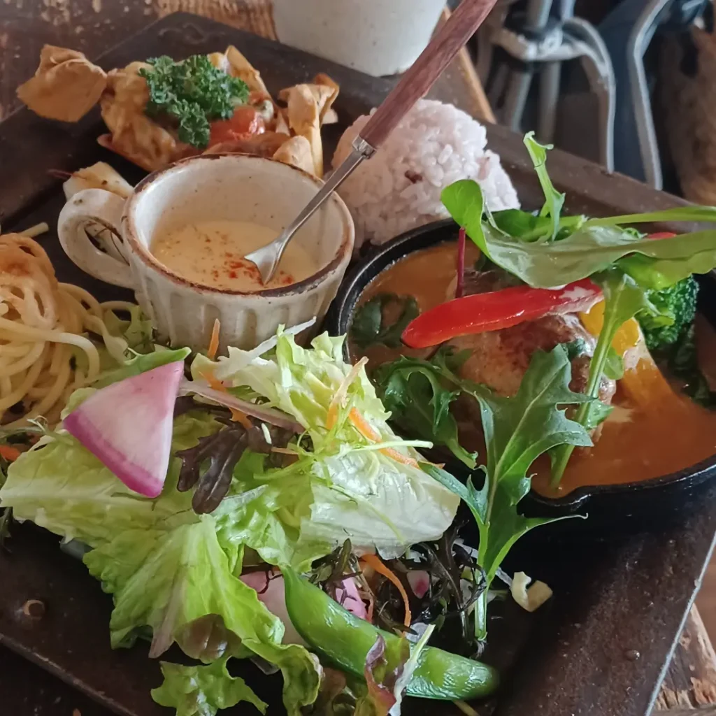 メニューはカレーやアジアンごはんなど、スパイスを使いながらも体にやさしい無国籍料理が中心。